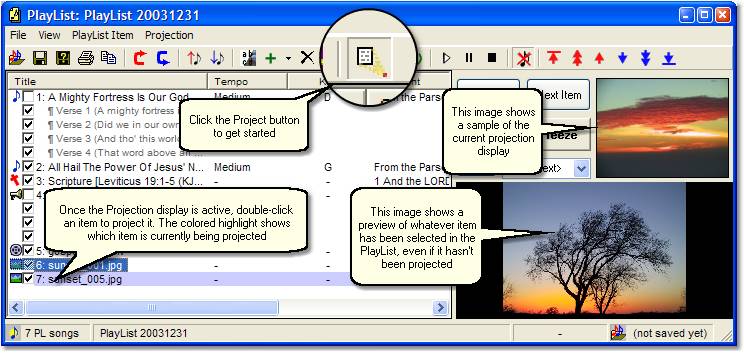 Video files (*.mpg, *.avi, *.qt, *.mov) can be added to the PlayList; just about any file that Windows Media Player can handle can be projected!