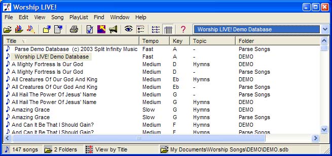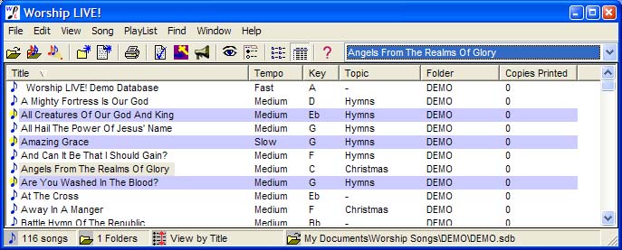 A database of about 120 public-domain songs is shipped with Worship LIVE! to get you started. You can also purchase add-on